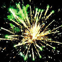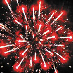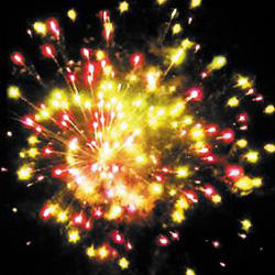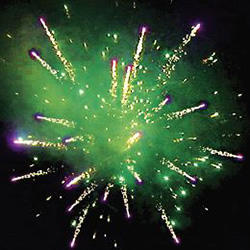 Желто-красная сфера (пион). Зеленые звезды с пышными хвостами (кокос) и белое мерцание. Фиолетовые звезды с пышными хвостами (кокос) и зеленое мерцание. Красочная концовка. ЗАЛП: Красные звезды с пышными хвостами (кокос) и треск.