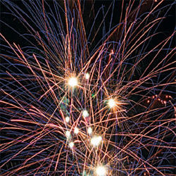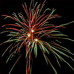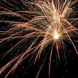 Разноцветные, свистящие кометы разрываются сферами из цветных, мерцающих и трещащих огней с золотыми и серебряными форсами. Красочная концовка из нескольких залпов.