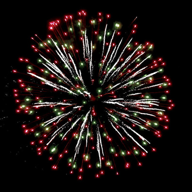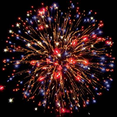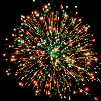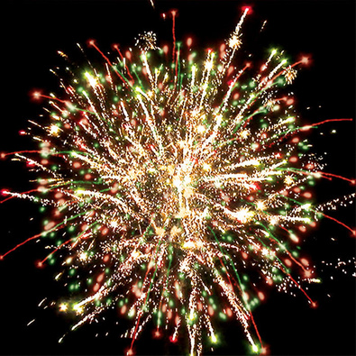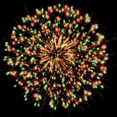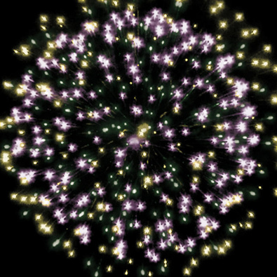 Разноцветные кометы разрываются сферами из золотых и серебряных форсов с цветными мерцающими огнями на концах. Мелких ярких серебряных огоньков с громким звуком.