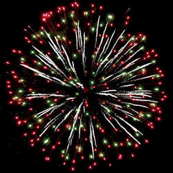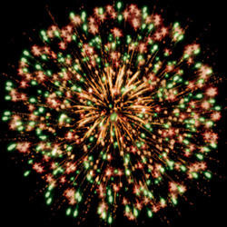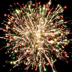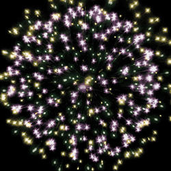 Разноцветные кометы разрываются сферами из золотых форсов с цветными, мерцающими огнями на концах, множеством трещащих сфер и искр, мелкими, яркими серебряными огоньками с громким звуком.
