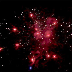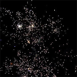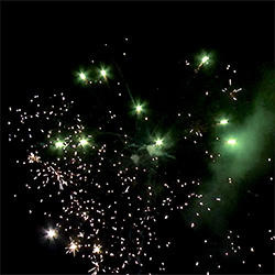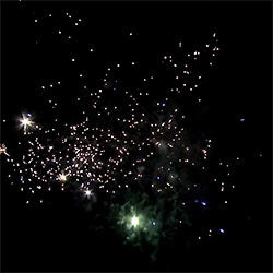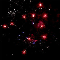 Разноцветные кометы разрываются сферами из: красных огней и множества трещащих сфер; зеленых огней и множества трещащих сфер; синих огней и множества трещащих сфер; фиолетовых огней и множества трещащих сфер; серебряных форсов и трещащих золотых огней.