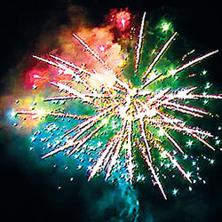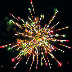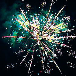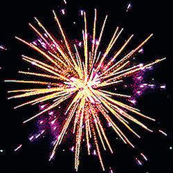 Разноцветные кометы разрываются сферами из: трещащих огней, серебряных форсов с красными и зелеными огнями на концах; золотых форсов, синих и фиолетовых огней; золотых форсов и зеленых мерцающих огней; серебряных форсов с серебряными трещащими искрами, красных, синих и зеленых огней; серебряных форсов с серебряными трещащими искрами и серебряных мерцающих огней; золотых форсов с красными и зелеными огнями на концах; золотых форсов с красными мерцающими, зелеными мерцающими, серебряными мерцающими и трещащими искрами.