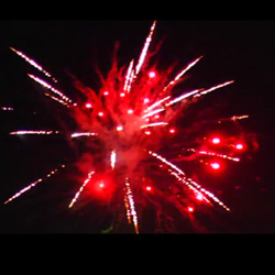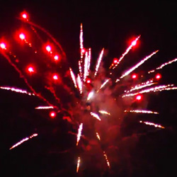 Красная комета разрывается на красные хвосты с серебристым треском и зеленым жемчугом, зеленые хвосты с мерцающими стробами и красным жемчугом. Серебряная пальма с красными и зелеными кокосами и шуршащими отблесками, залп парчовых пальм с треском.