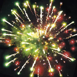 Разноцветные, серебряные звезды с пышными хвостами. Ооблако треска. Цветное мерцание. Залп всех эффектов.