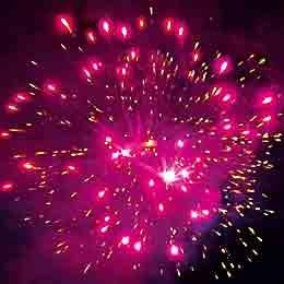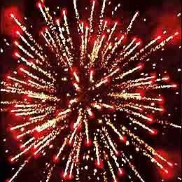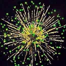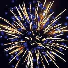 Красные, синие, фиолетовые звезды с золотыми хвостами, белым и золотым мерцанием. Красные, синие, зеленые звезды и золотые шуршащие хвосты. Синие, зеленые, красные букетики огней и оранжевое мерцание и облако трещащих разрывов. Красочная концовка: большая сфера золотых хвостов и мерцающие, трещащие искры.