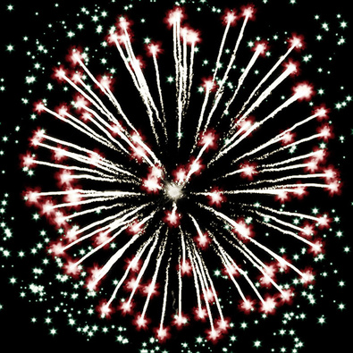 Разноцветные кометы разрываются сферами из серебряных форсов с цветными мерцающими огнями и множеством трещащих сфер.