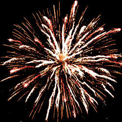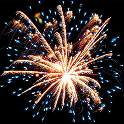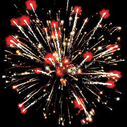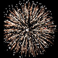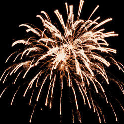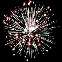 Разноцветные кометы разрываются сферами из золотых и серебряных форсов с цветными, мерцающими огнями на концах и множеством трещащих разлетающихся искр.