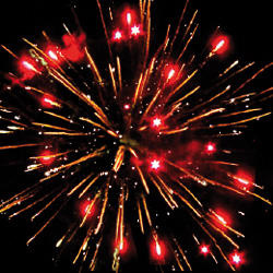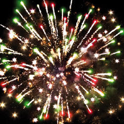 Разноцветная мерцающая сфера. Множество золотых и серебряных ниспадающих нитей. Цветные звезды с пышными хвостами и треск.