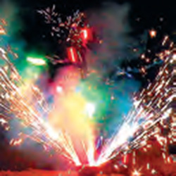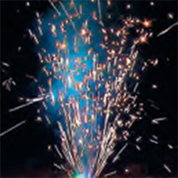 Поток серебряных огней, вращается со свистом и выбросом серебряных, красных, зеленых, синих, трещащих огней, в основании красное и синее пламя.