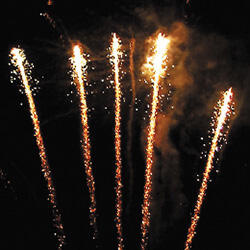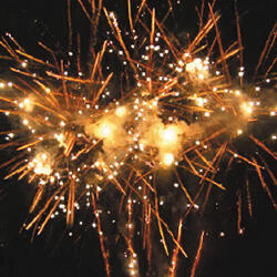 Трещащая комета разрывается множеством золотых ниспадающих нитей и цветным мерцанием. Веер.Разрыв золотыми букетами. Множество золотых ниспадающих нитей и треск. Золотые звезды с пышными хвостами.