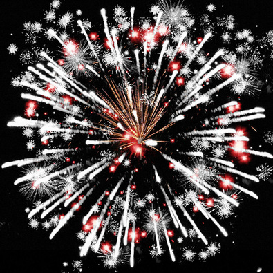 Разноцветные кометы разрываются сферами из серебряных форсов, крупных цветных мерцающих огней с серебряными трещащими искрами.