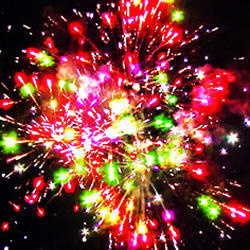 Красные звезды с пышными хвостами (кокос) и облако трещащих разрывов (трещащая хризантема). Сфера золотых хвостов с переходом в красно-синие звезды (цветная хризантема). Красно-зелено-синяя сфера (пион) и облако трещащих разрывов (трещащая хризантема). Множество золотых ниспадающих нитей (парча) и золотое мерцание. Множество золотых ниспадающих нитей (парча) с красными звездами на концах и зеленое мерцание. Красочная концовка: Красно-желто-зелено-фиолетовые шуршащие разлетающиеся кометы (паучки).