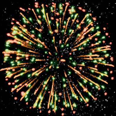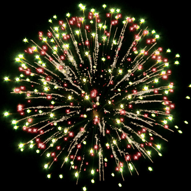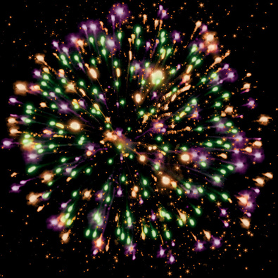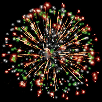 Разноцветные кометы, свистящие элементы разрываются сферами из цветных мерцающих огней, золотых форсов с серебряными искрами и множества трещащих серебряных сфер.