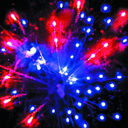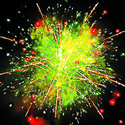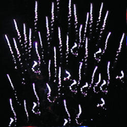 Выстреливает подряд: Сфера золотых хвостов с переходом в белые звезды (белая хризантема). Множество серебряных ниспадающих нитей (парча) и облако трещащих разрывов (трещащий дождь). Выстреливает подряд: Красные и зеленые звезды с хвостами (волна) и облако трещащих разрывов (трещащий дождь). Свистящие змейки. Красно-синяя сфера (пион). Мерцающие золотые хвосты (мерцающая ива), зеленое мерцание и красные звезды.