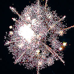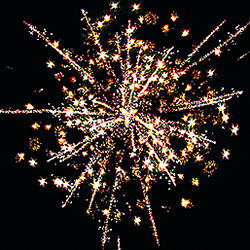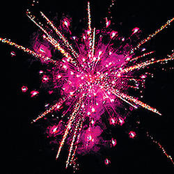 Золотые трассы разрываются сферами из: фиолетовых огней и золотых форсов с трещащими искрами; золотых трещащих огней и золотых форсов с трещащими искрами; мелких серебряных трещащих огней и золотых форсов с трещащими искрами.