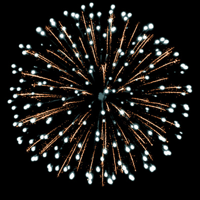 Трещащие с золотыми искрами трассы разрываются сферами из коротких искристых золотых форсов и цветных огней.