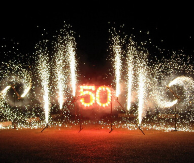 Линии фонтанов начинают шоу. Далее цветными огнями загораются два трилистника. После этого подключается цветная огненная надпись с именем юбиляра. По краям вращаются две серебряные вазы с форсом трещащих искр до трех